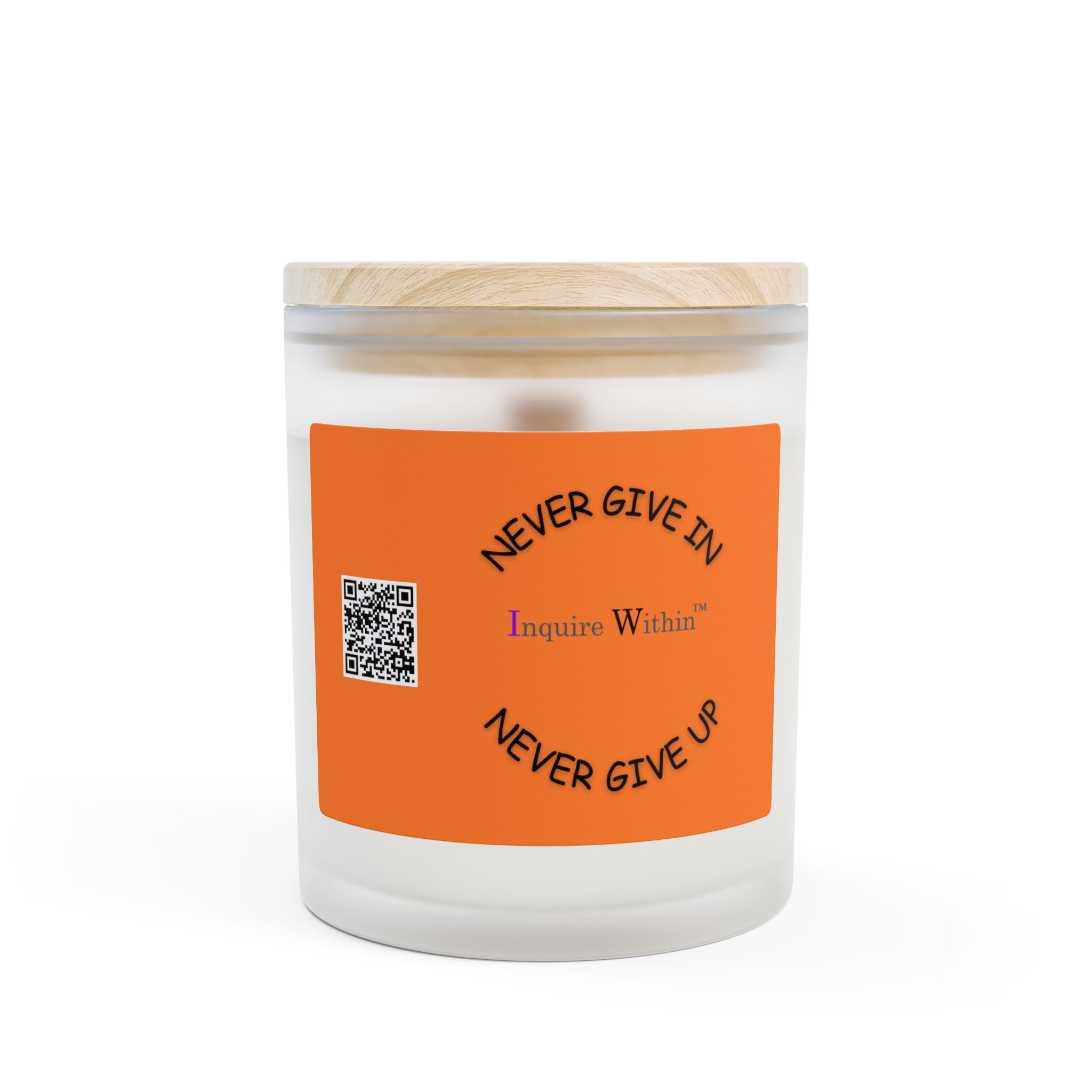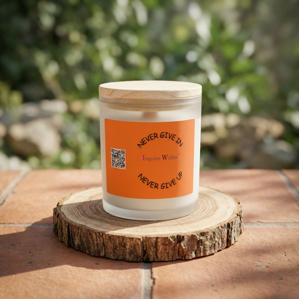 Warm, quiet light meets gentle, hand-poured scent. This frosted glass candle sits in a soft, matte vessel topped with a raw maple lid and a wooden wick that crackles like a small hearth. The label’s simple mantra — “Never Give In / Never Give Up” — wraps the space in steady encouragement. Light it during evening reflection, an at-home study session, or when you want a calm companion through a long night. The off-white, dye-free wax burns clean and steady for about 50 hours, releasing a thoughtfully blended fragrance that feels familiar without overwhelming the room. It’s made from renewable, vegan-friendly wax and finished with bright, crisp printing that keeps the message clear and hopeful.