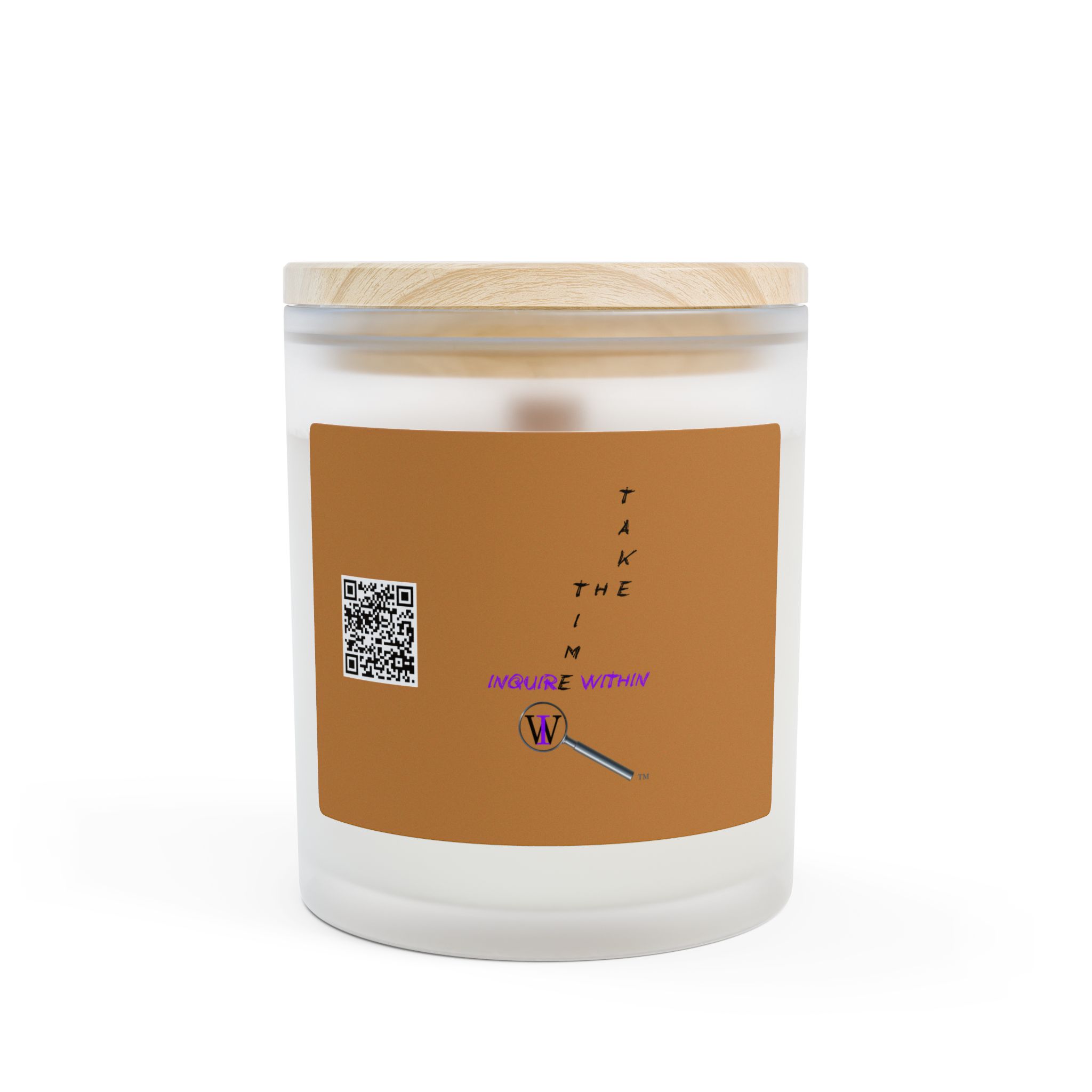 Warm, quiet light meets gentle, hand-poured scent. This frosted glass candle sits in a soft, matte vessel topped with a raw maple lid and a wooden wick that crackles like a small hearth. The label’s simple mantra — “Take The Time