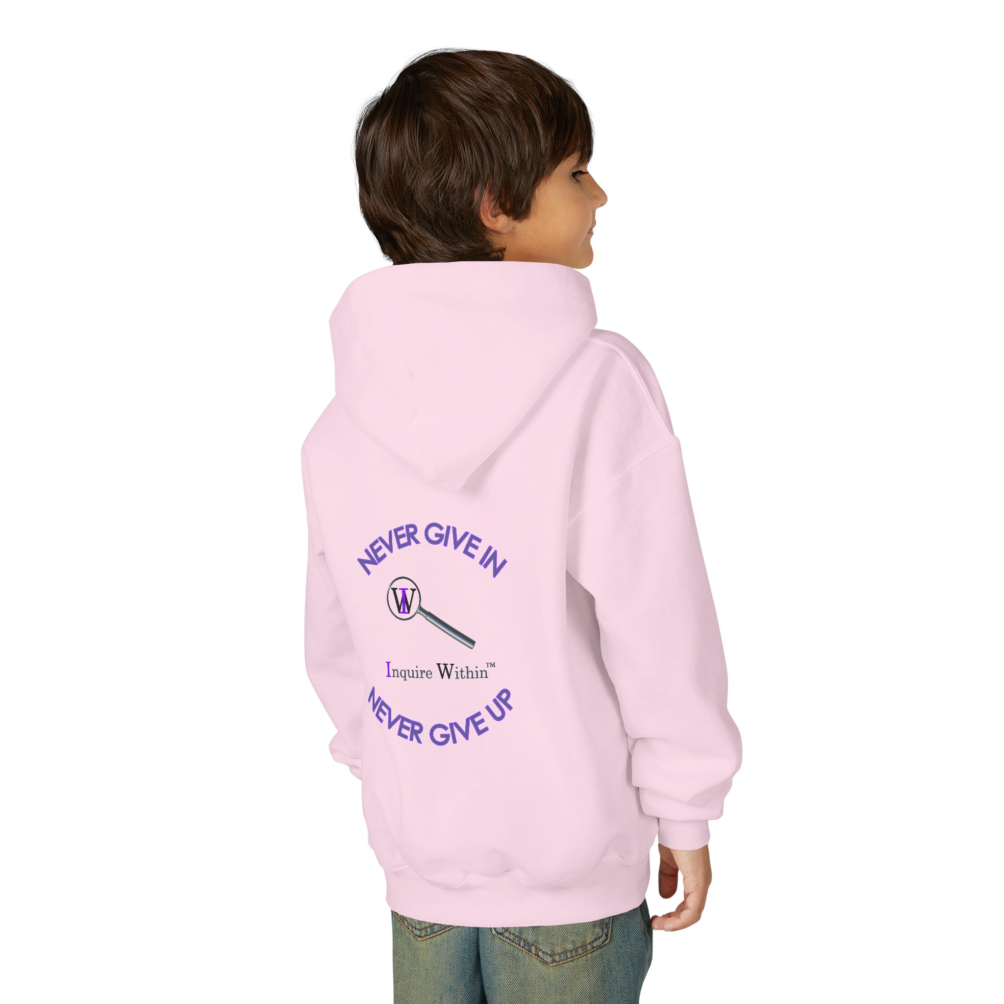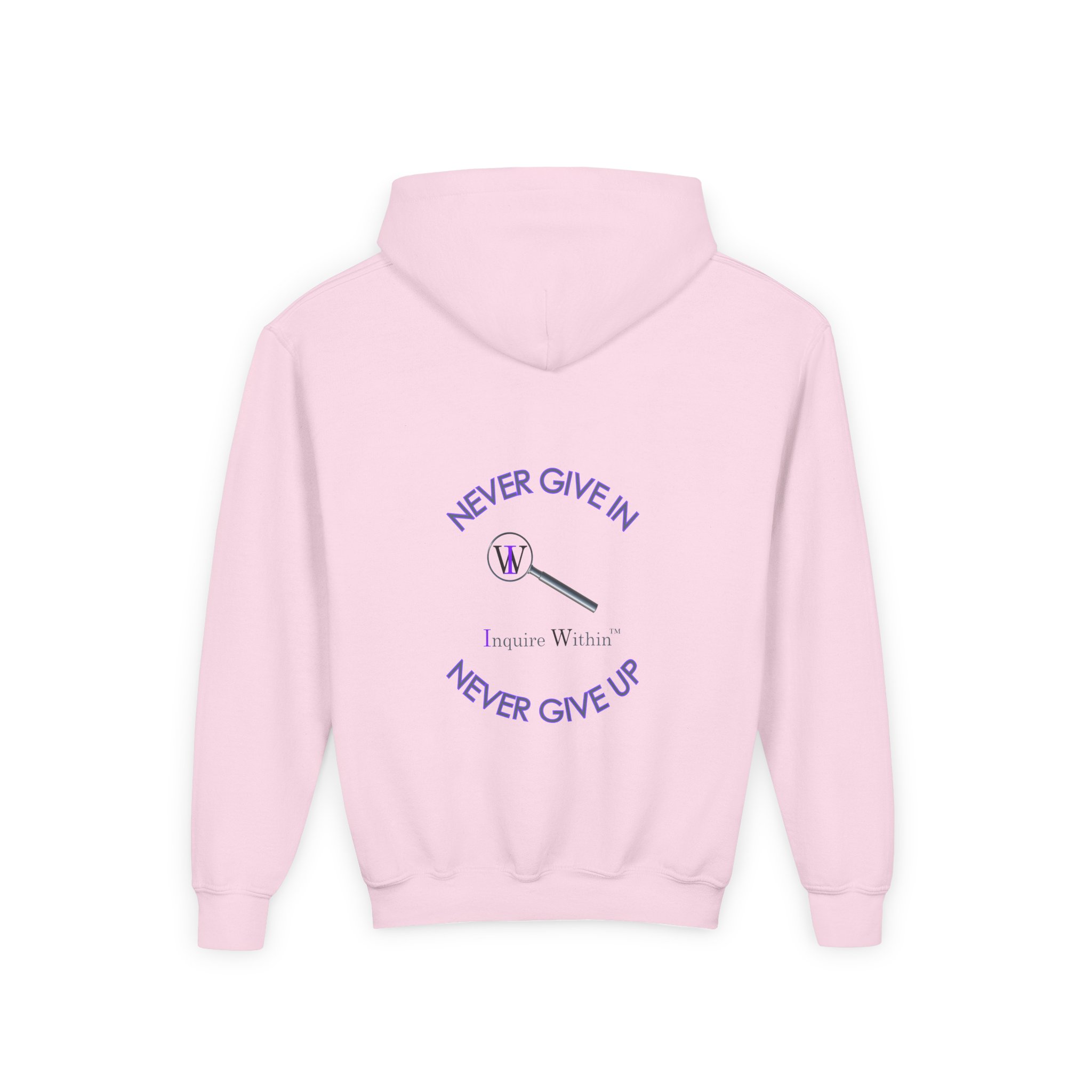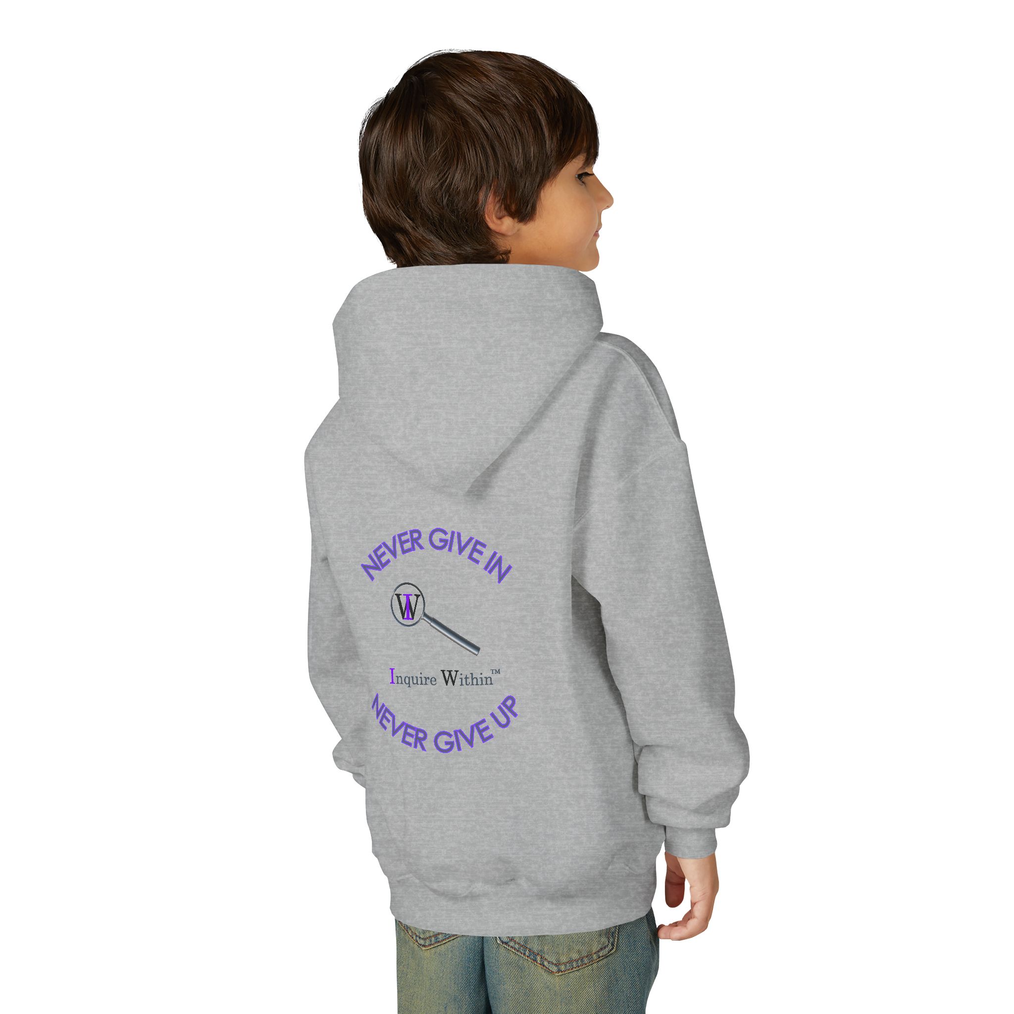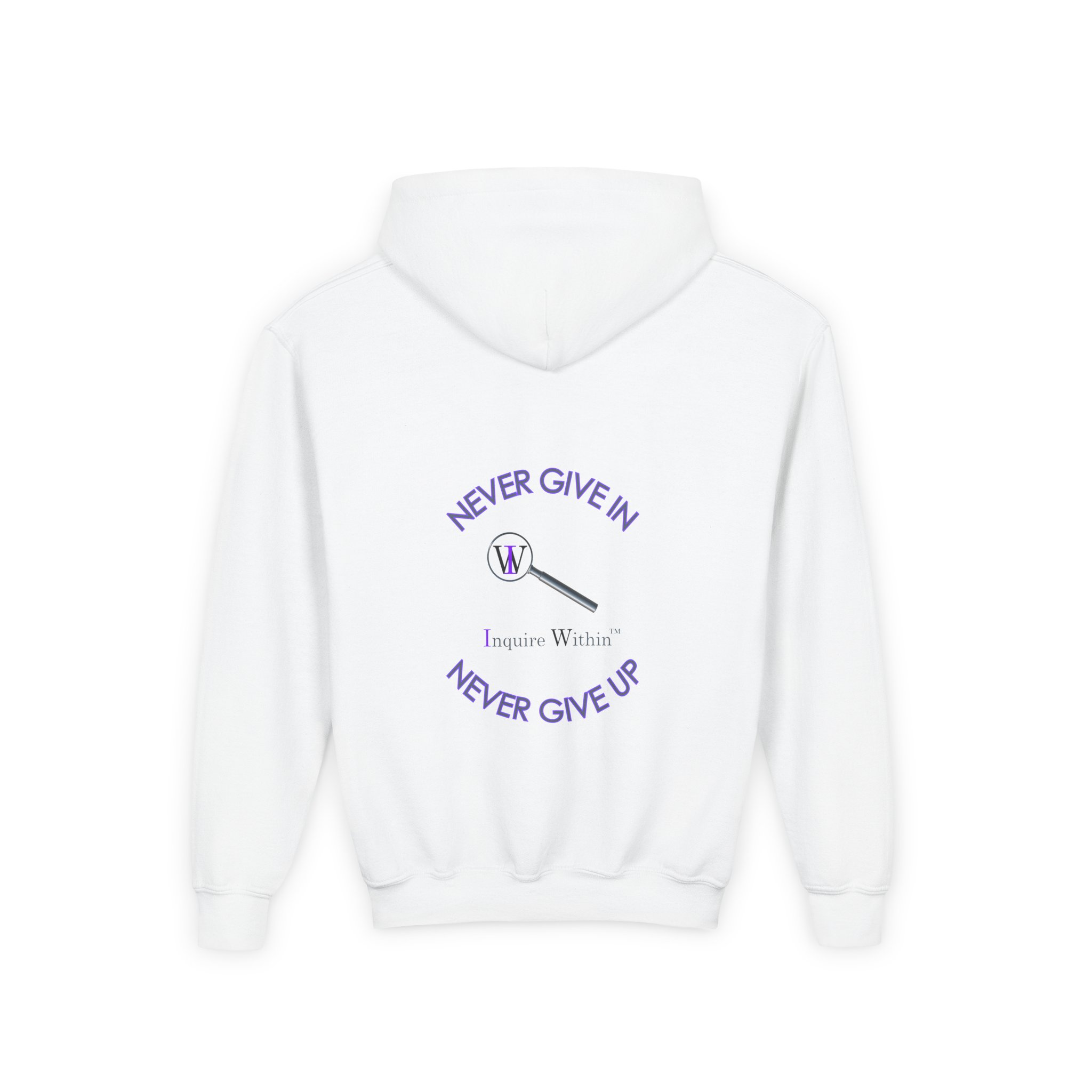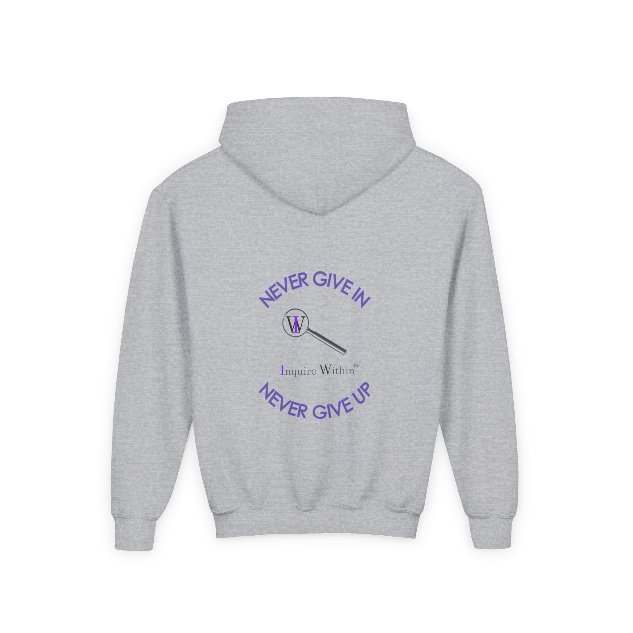 Inspirational Youth Hooded Sweatshirt – “Never Give In, Never Give Up”