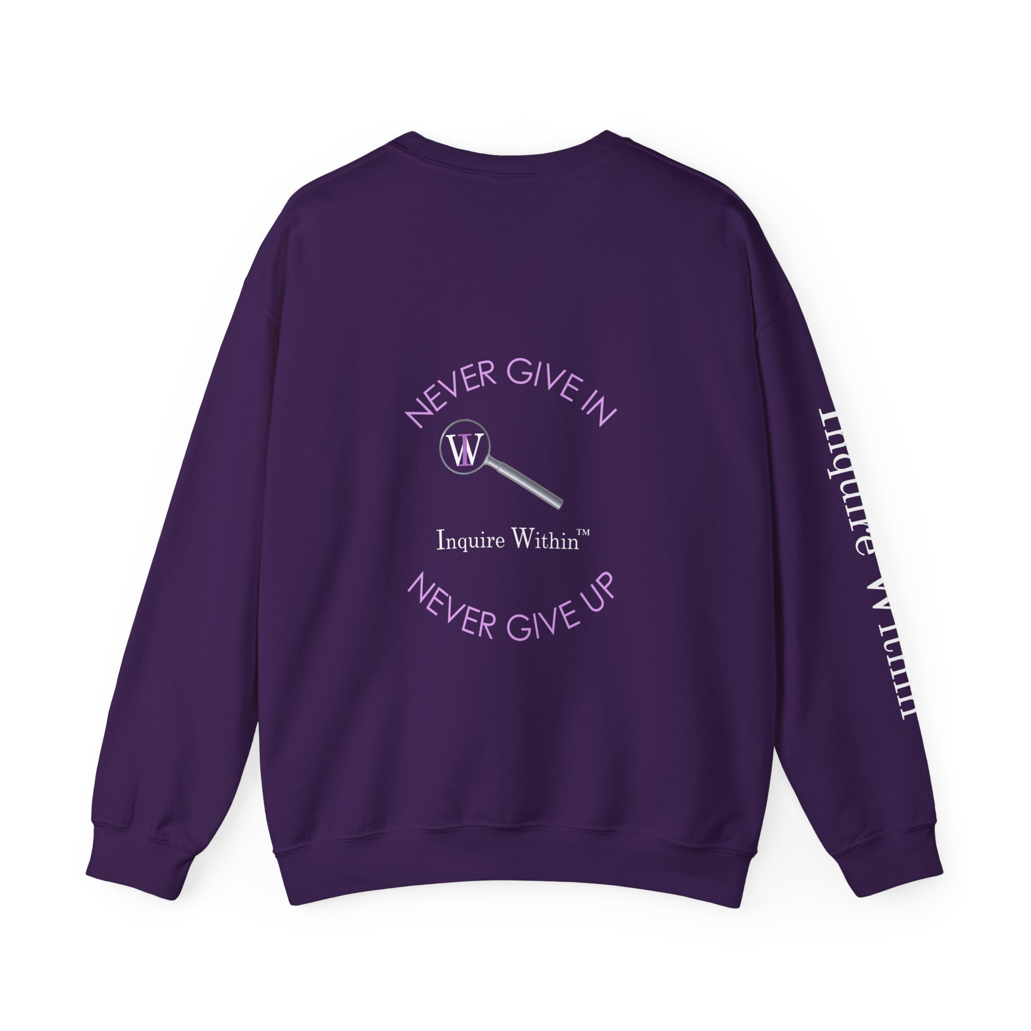 Motivational crewneck sweatshirt featuring ‘NEVER GIVE IN, NEVER GIVE UP’ logo on the full back, right sleeve tagline, left chest and arm spyglass with tag line. A great conversation piece to promote mental health, encouraging self-reflection and self-improvement. Target audience includes individuals passionate about personal development and positivity. Relevant for holidays and celebrations promoting mental wellness.