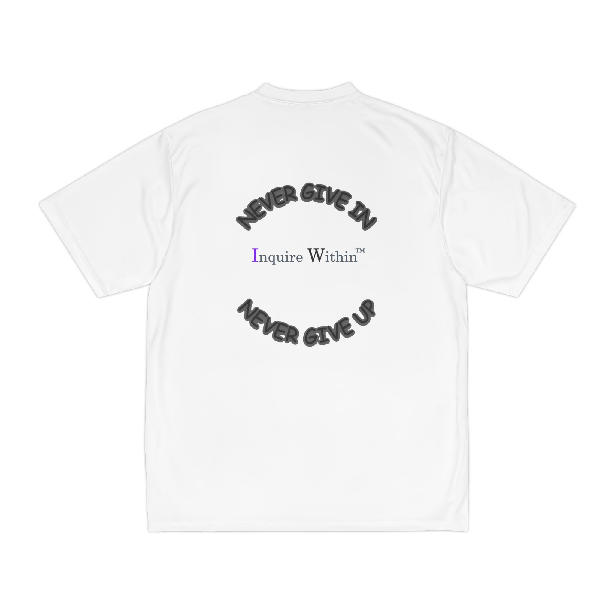 This motivational Men’s Performance T-Shirt is perfect for athletes and fitness enthusiasts. The design features a ‘NEVER GIVE IN, NEVER GIVE UP’ logo on the full back with a spy glass on the left chest. It is made of moisture-wicking material, ideal for workout sessions, and provides an inspirational training top for active individuals. This T-shirt is great for those who love to push their limits and stay motivated during workouts. Perfect for gifting on birthdays, holidays, or any occasion.