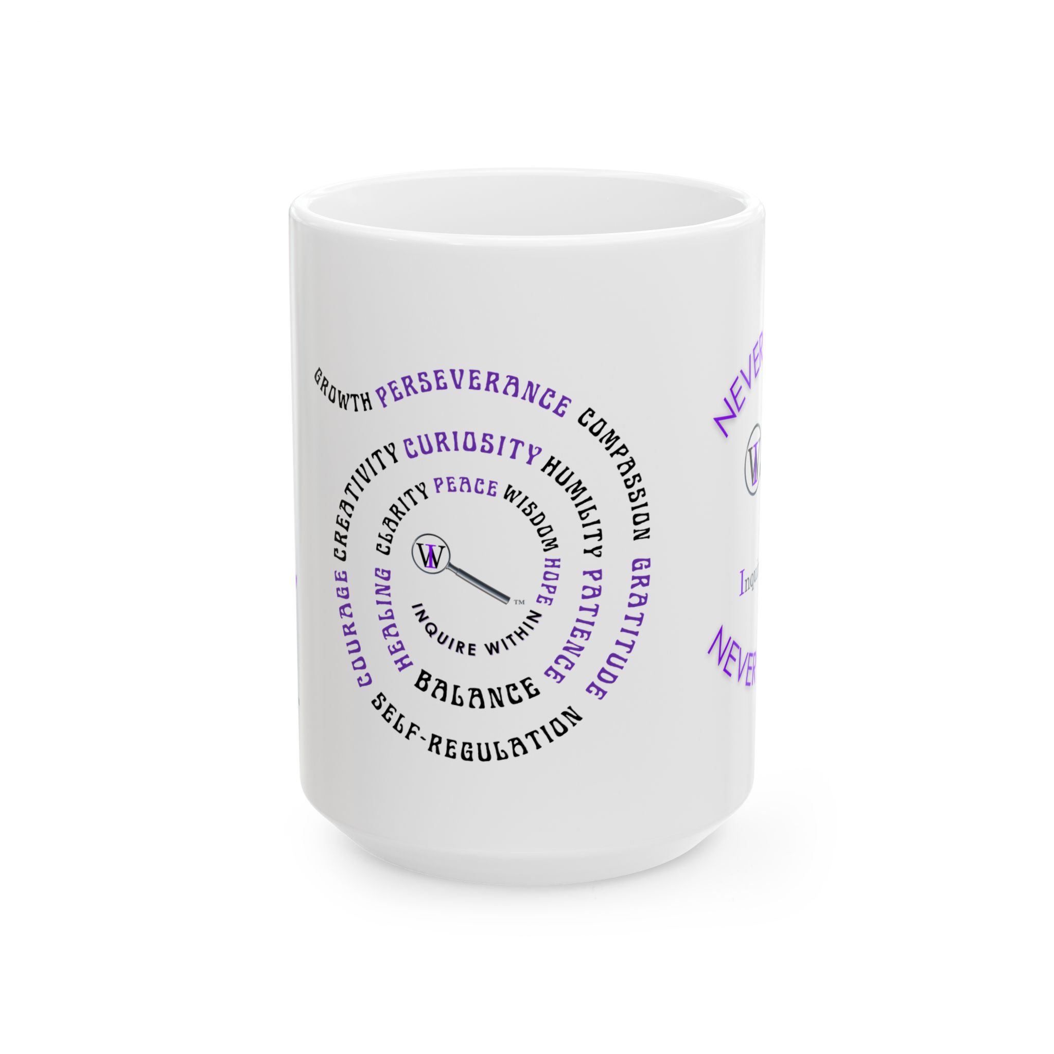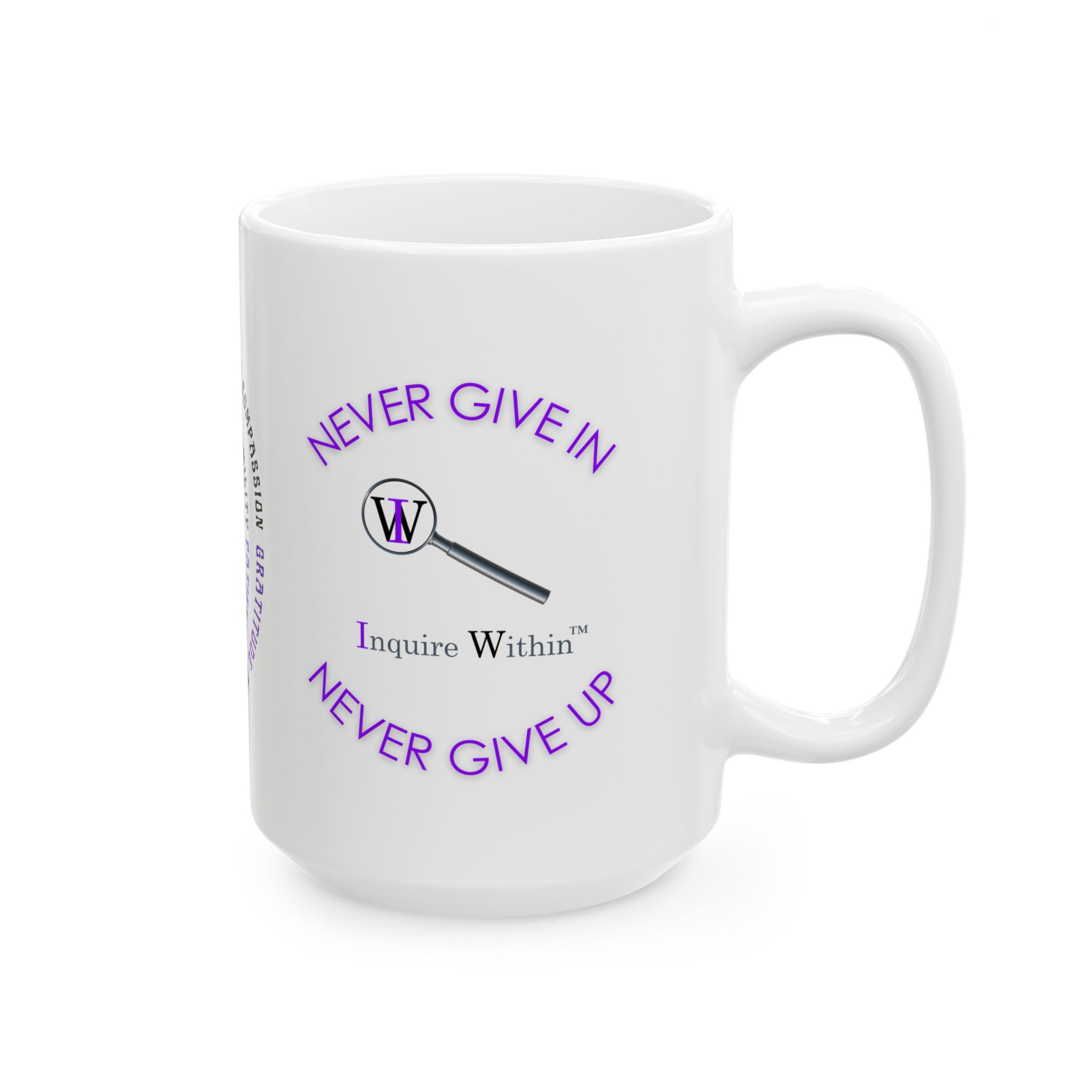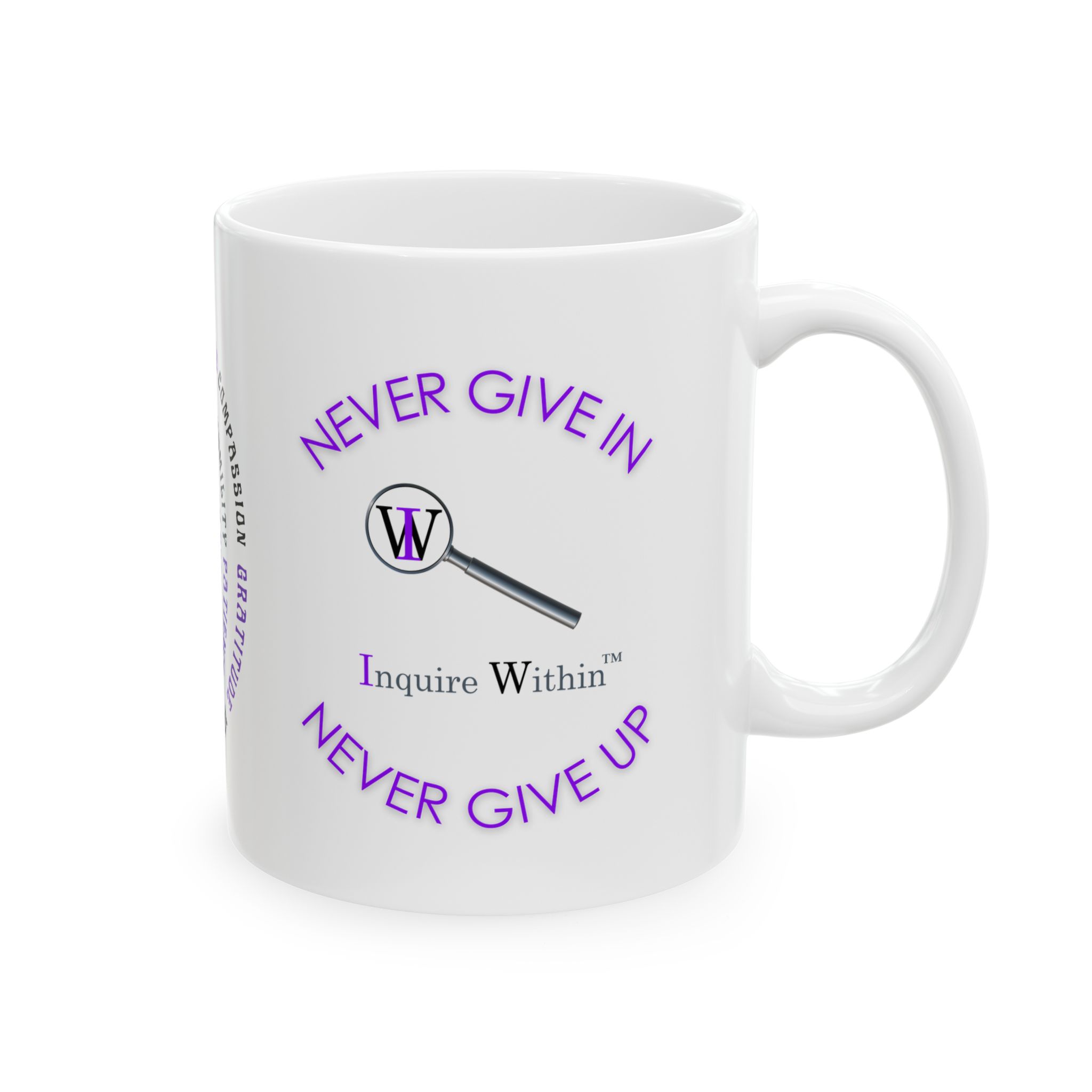 This motivational ceramic mug features the original logo’s ‘Take the time’ “Never Give In, Never Give up” and the ‘Motivational Swirl’ design. It serves as an inspirational coffee cup, perfect for daily use or as a gift for friends. The vibrant colors and motivational message create a positive vibe that fits seamlessly into anyone’s morning routine. Ideal for those seeking a daily dose of motivation and positivity.